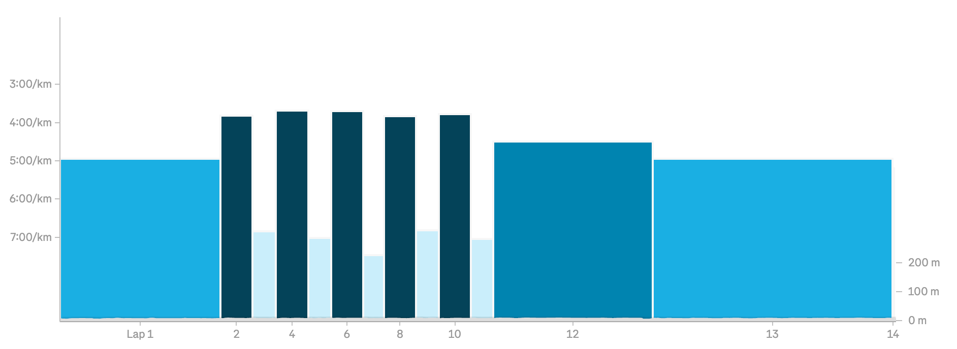 Altogether, it adds up to roughly 10K for the entire session. Below, you’ll find the structure I’m following. For the first two weeks, I started with 5 repeats at Anaerobic34 speed and added one extra repeat in the last two weeks. The plan will shift slightly for the upcoming weeks, but I’ll cover that in a future post.