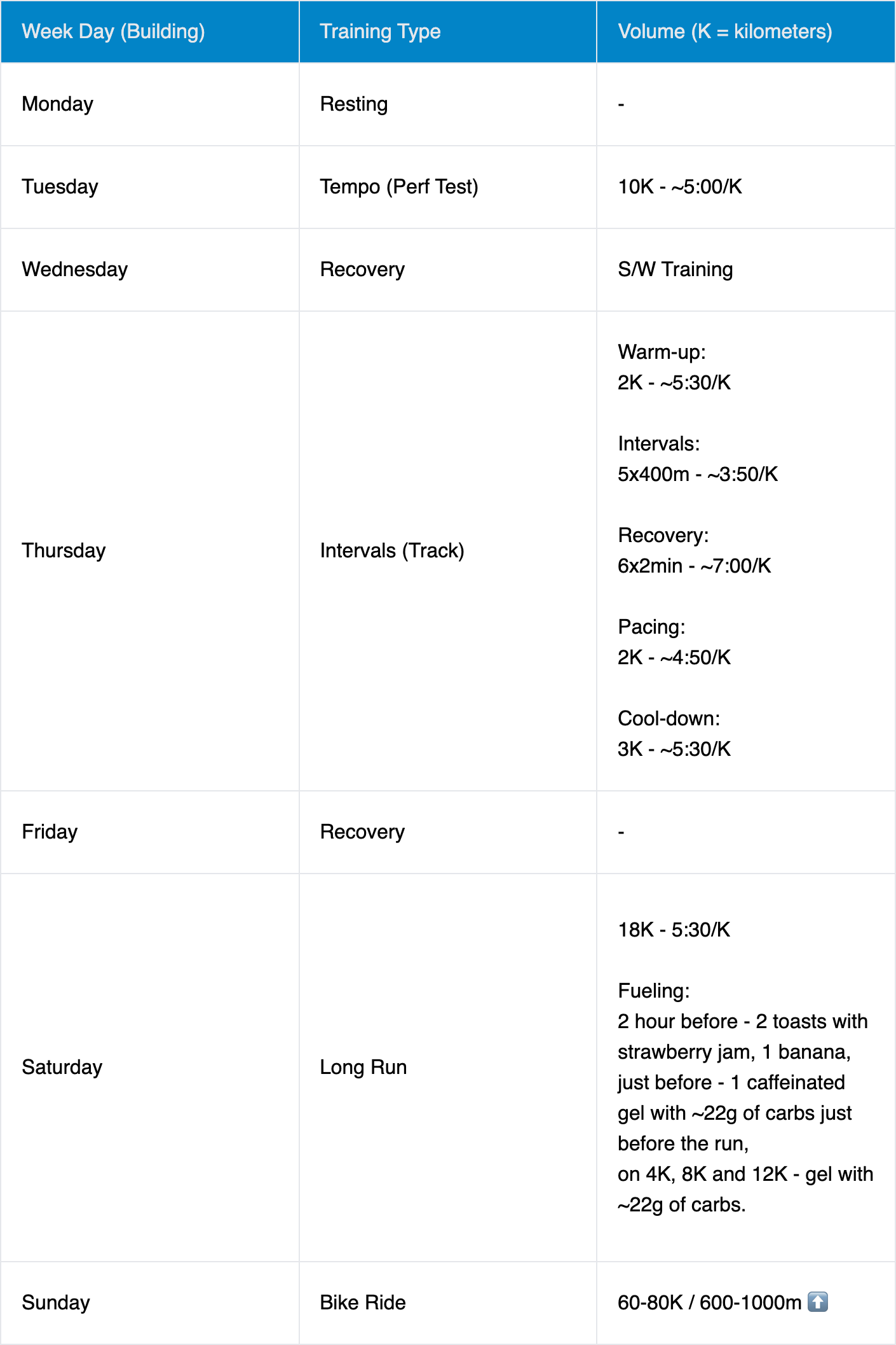 I’ll include some final notes on how you can adapt these weekly cycles to fit your own training schedule and goals. I assume tho that you’re like me - an aspiring mid-level runner and modifications would not be needed; at least the big ones. OK, let’s get straight to the point - the week plan.