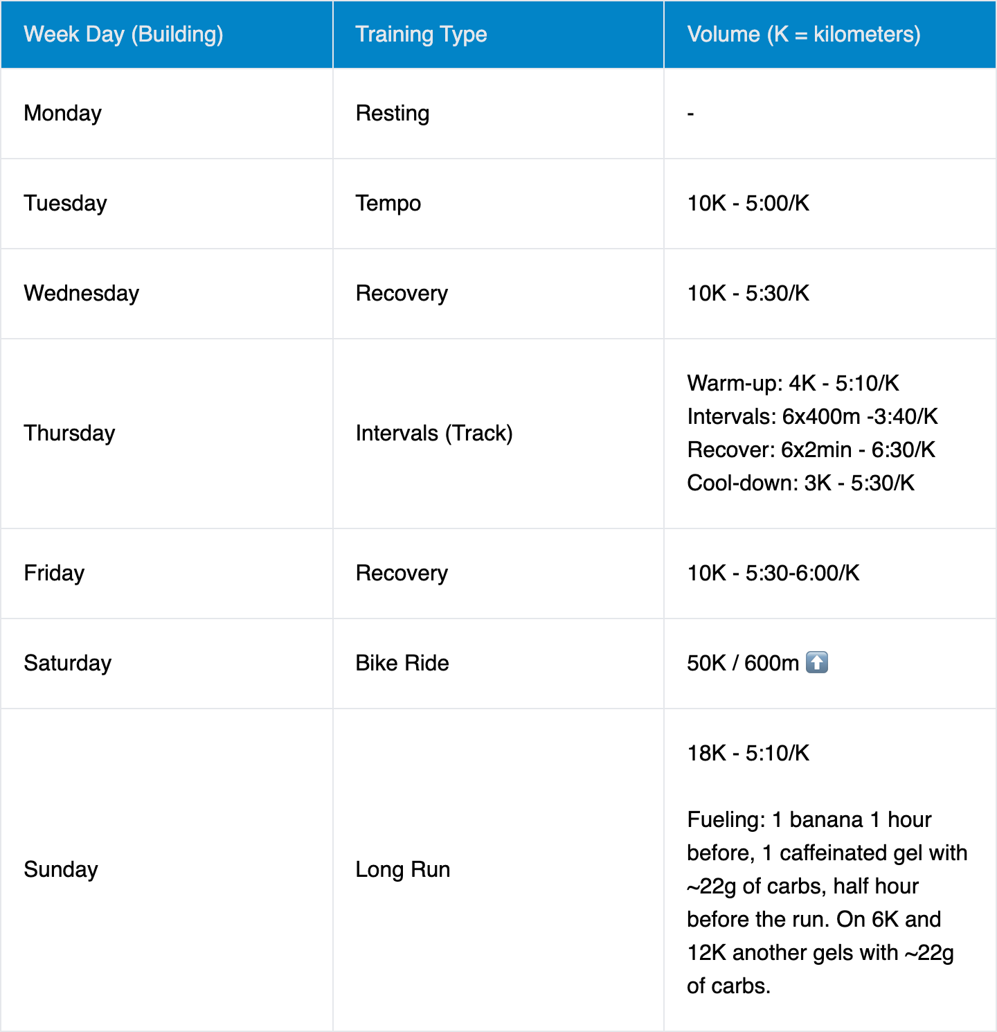 You can read more about the structure of Week 2 of my building phase here. Week 3 followed a similar pattern, with consistent effort across all my planned runs, but I made a few tweaks to push myself further. I increased the intensity slightly, especially during my tempo runs, and added an extra fast-paced interval to my track session. It felt great - I could sense real progress and forward momentum. Below, you’ll find a detailed table with all the sessions I completed during the week.